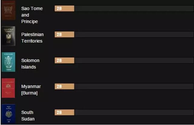 倒数并列第一:圣多美与普林希比共和国、巴勒斯坦、所罗门群岛、缅甸、南苏丹